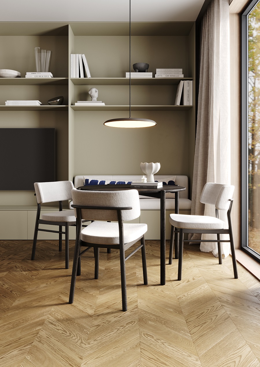 • Керамогранит в ТВ-зоне на стене + кварцпаркет ёлочкой на полу — неоклассика в уютной гостиной для спокойных вечеров.